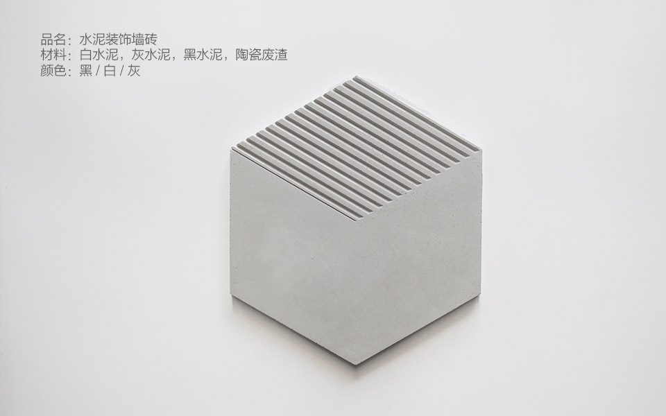 在亚洲,随着陶瓷品质要求的提升,越来越多次品陶瓷废渣被丢弃填埋,占用耕地,污染当地生态环境。我们将它与混凝土相结合制作墙砖。在生产上,瓷砖废渣经粉碎后与自行研发的混凝土混合充当成分,加入木糠粉纤维,以增强韧性,减轻重量。一体出模,不再外加装饰,减少生产成本,便于实现工业化批量生产。在设计上,运用光影成像原理,在二维的几何画面上打造三维立体效果,极具装饰性和艺术性。在此基础上,“六”既能实现环保意义,又能将瓷砖废渣转化为极具使用价值,能批量生产的产品,甚至形成可持续发展的产业,因而具有独特的意义。