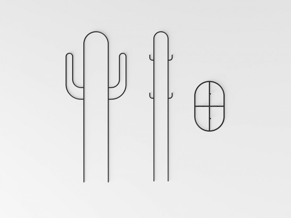 整体设计利用金属材料的特点,以纯线条勾勒仙人掌的外轮廓,以践行“温润的极简主义”。三个坐标面上的金属部件两两垂直,组装而成为一个有三维空间感的家具,以此兼具视觉的通透性、包装运输方面的轻量化、使用易拆装等优点。设计师利用仙人掌“分枝”的造型特点来达成“衣帽架”的功能性需求,同时使产品自身装饰化。在相应风格的家装环境,抑或工装(如服装店)中,仙人掌衣架作为一件装饰家具,可适应多种不同场景,如自然主题、波普艺术等,平衡空间的趣味性与设计感,恰当削减过于冷淡的氛围,同时保证空间的可使用性。